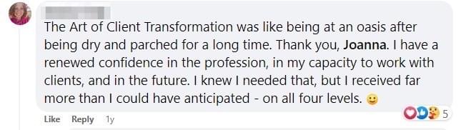 Because of the depth, quality, caring and extraordinary skills that Joanna brings to her work, her business runs mainly through happy clients that re-sign with her over and over again, and the referrals they send to her.