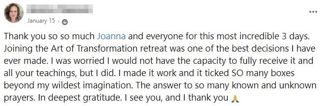 Joanna is a potent combination of depth and sacredness with laser focused strategy, and she has a magical way of supporting each student to feel seen, heard, and loved.